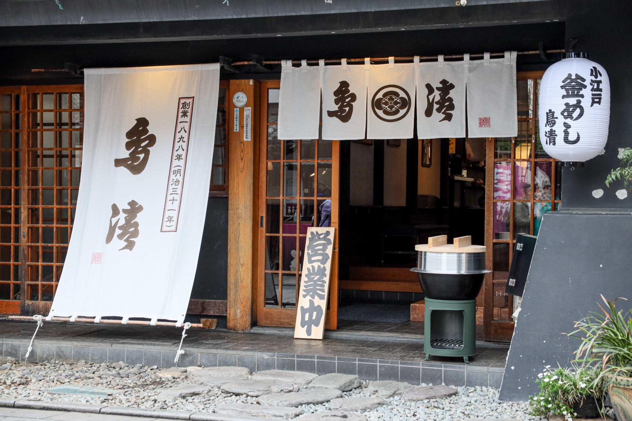時の鐘の目の前。創業明治31年から127年に渡り「のれん」を引き継いでおります。今では釜めし専門店として約20種類をご用意。1階の中庭では鯉の泳ぐ池があり、街の雑踏から離れ、ゆっくりした時間をお楽しみください。