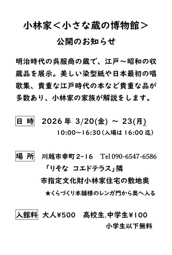 川越市指定文化財「小林家住宅」の文庫蔵を公開し、呉服太物商時代の染型紙も含め、明治から昭和までの人々の暮らしがわかる様々な収蔵品を展示します。