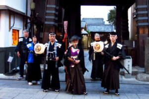 江戸時代の「火付け盗賊改め」の装束をまとった「川越奉行所見廻り組」が一番街を見廻り。一般参加も可能です。歴史情緒あふれる町歩きをぜひ体験ください。
