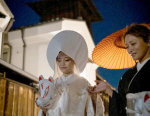 小江戸川越の町並みを背景に、幻想的で神秘的な「狐の嫁入り」の行列を再現します。