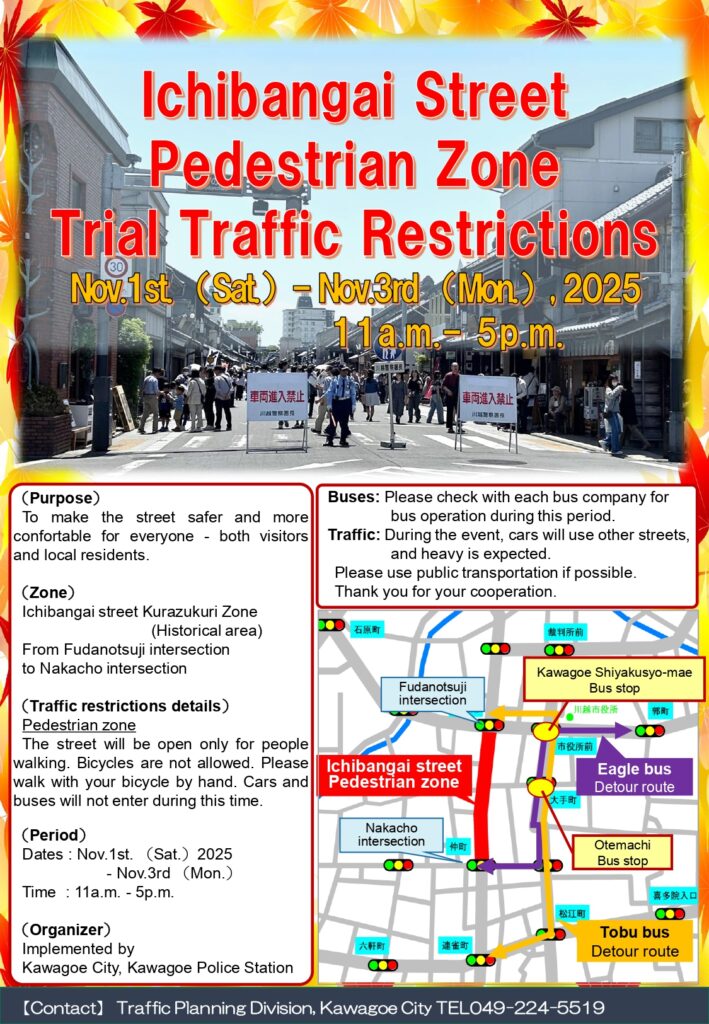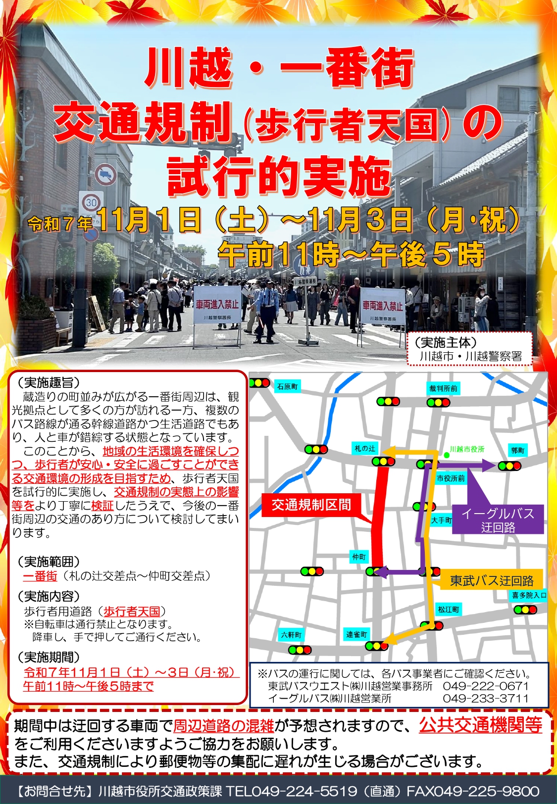 川越市役所交通政策課より、川越一番街(蔵造りの町並み)における「歩行者天国(歩行者用道路)」の試行的実施についてお知らせがありました。道路の混雑が予想されますので、公共交通機関のご利用、中心市街地の迂回にご協力ください。