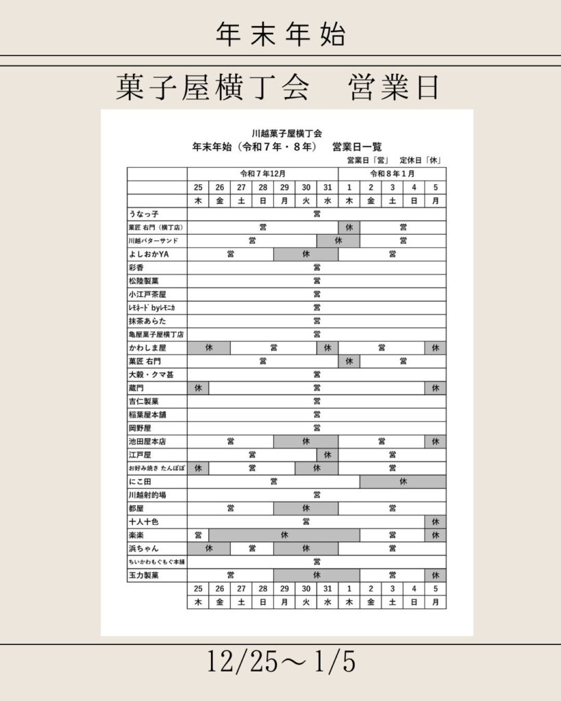 令和7年12月25日(木)~令和8年1月5日(月)の菓子屋横丁会営業日です。
